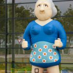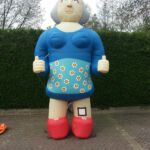 Deze mooie Sarah pop van 3m hoog staat en heeft een schort om.